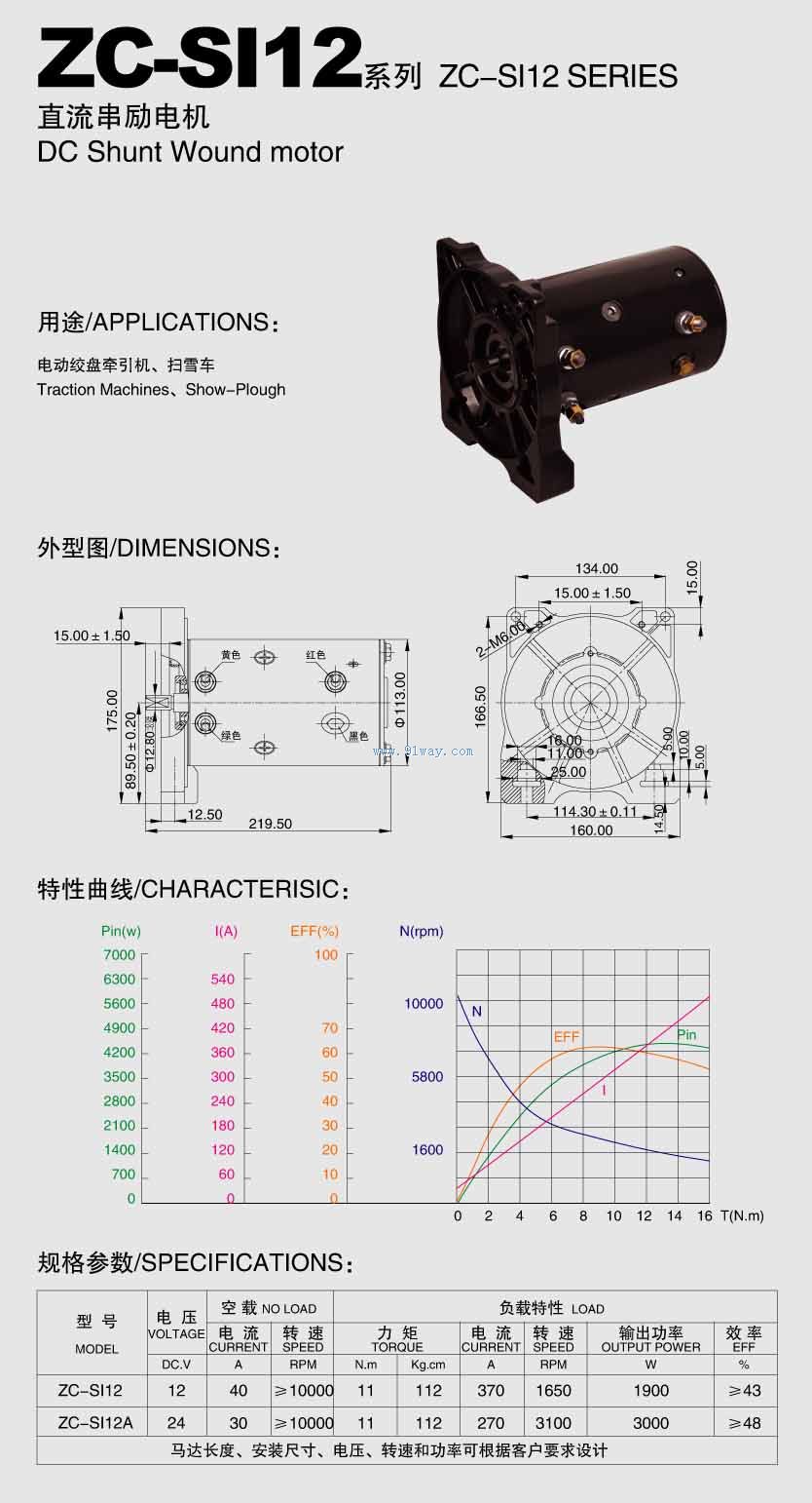 ZC-SI12型直流串勵電機串勵電機ZC-SI12 產品用途:電動絞盤, 掃雪車 電壓:12/24V 負載電流:270-370A 輸出功率:1900-3000W 負載轉速:1650-3100RPM 力矩:11N.m