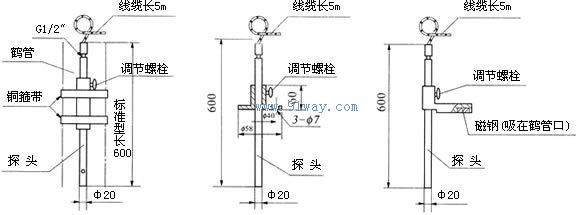 探頭安裝方式分:捆綁式(見圖1)法蘭式(見圖2)和磁鋼固定式(見圖3)三種,三種方式探頭上下長(zhǎng)度均可快速調(diào)整。