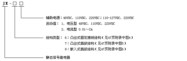 3、動作時間:不大于15ms。 JX-60,70,80系列靜態信號繼電器型號說明