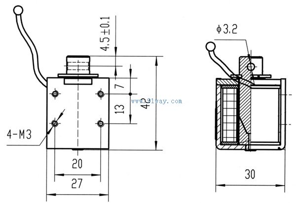 JQ剝線機(jī)電磁鐵適用于自動(dòng)剝線機(jī)作為執(zhí)行元件。 性能 工作電壓:24VDC JQ型剝線機(jī)電磁鐵外形及安裝尺寸