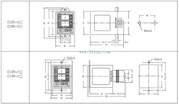 | ON/OFF時(shí)間范圍--秒:9.99,99.9,999 分鐘:9.59,99.9,999小時(shí):9.59,99.9,999 | CV3R-□ | CV3R-□2S | CV3R-□T | CV3R-□T1 | |