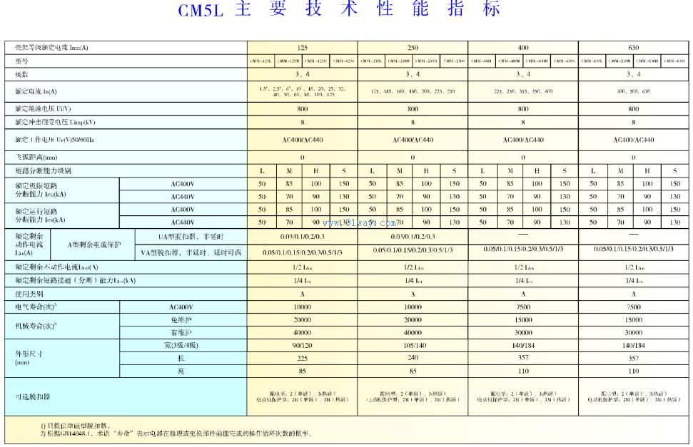 CM5L系列斷路器為帶剩余電流保護熱磁可調型漏電斷路器,有125A、250A、400A、630A四個殼架,電流從1.5 A~630A,剩余電流從30mA~3A。