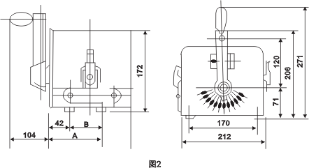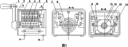 1、本系列控制器為了滿足生產(chǎn)需要其操縱機構(gòu)(1)制成手柄式和手輪式2種形式。一般用于手柄式則為臥式安裝,并且其手把可以垂直于手柄或者與手柄為一條軸線進行工作,手輪式則適用于立式安裝,基架是同端蓋2與底架5通過支柱(4)與上下兩條支柱用螺釘連結(jié)成一體,從而接觸組(7)可以固定于左右兩支柱(4)上。凸輪轉(zhuǎn)軸(8)是由凸輪片疊積而形成,定位棘輪(11)裝入軸之尾部,其軸向緊固是依靠手柄端固定螺栓與尾端之墊圈(13)、弓形板(12)及螺栓實現(xiàn)的。定位機構(gòu)是同懸架(6)與彈簧支持件(9)和兩個彈簧(14)組成的。滾子10通過塑料套安裝在彈簧支持件(9)上與棘輪作相對滾動。基架可安裝于底座(5)上,以罩(3)復蓋之構(gòu)成保護式