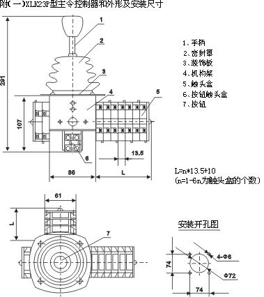 XLK23P是盤上操作、盤下安裝的新型控制器,整體采用高級工程塑料制成,它由“十”字方向或“一”字方向操縱機構及滅弧室、復位機構等組成,根據需要,每臺最多裝備四只控制器,每只控制器最多裝6個觸頭盒,每個觸頭盒式有兩對雙斷點觸頭,控制兩條獨立的回路。手柄上有應急按鈕,可做安全應急及其它特殊控制之用。