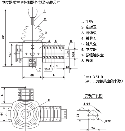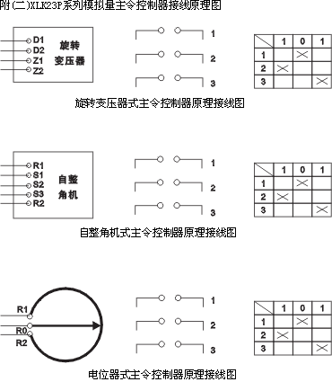 模擬量控制器。例:XLK23P-04B-404B2臺,十字方向操作。即自整角機型號為BD-404B操作方向為縱、橫十字方向盤面操作的控制器2臺。本產品配制標準接線圖,見附(二)。