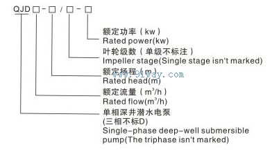QJD系列油浸式潛水泵由電動機和多級葉輪泵兩部分組成,水泵由葉輪、導葉、泵體、進水節、出水節及泵軸和軸套、軸承組成。電動機采用雙端面機械密封,密封圈為“O"形橡膠作靜密封。 型號說明: