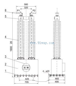1.吊板;2箱體;3.名牌及二次端子;4.硅橡膠傘群;5.一次井聯(lián):6.一次接線端子