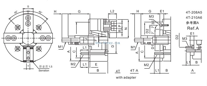 | 產品名稱: | 4T系列中實動力夾頭(四爪高速中實型) | |||||
