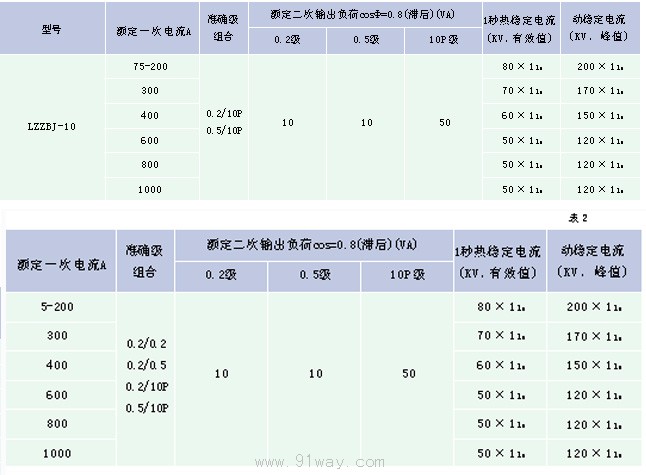 3.6 互感器的1秒額定短時熱電流、額定動穩定電流及額定負荷見表1及見表2。