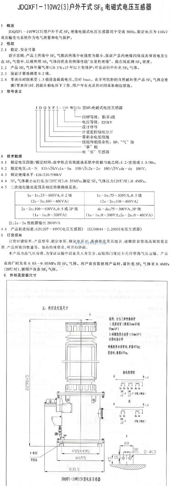 JDQXF1-110W2(3)系列戶外干式SF6電磁式電壓互感器技術(shù)參數(shù)