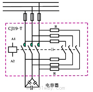 CJ19-T 接觸器通過一個提前接入的觸頭模塊和抑流電阻,抑制住電容器剛接通時的浪涌電流(如果不接入電阻,此時的電流相當于短路電流 ), 緊接著主觸頭閉合,主觸頭閉合后,提前接入的觸頭重新分開。
