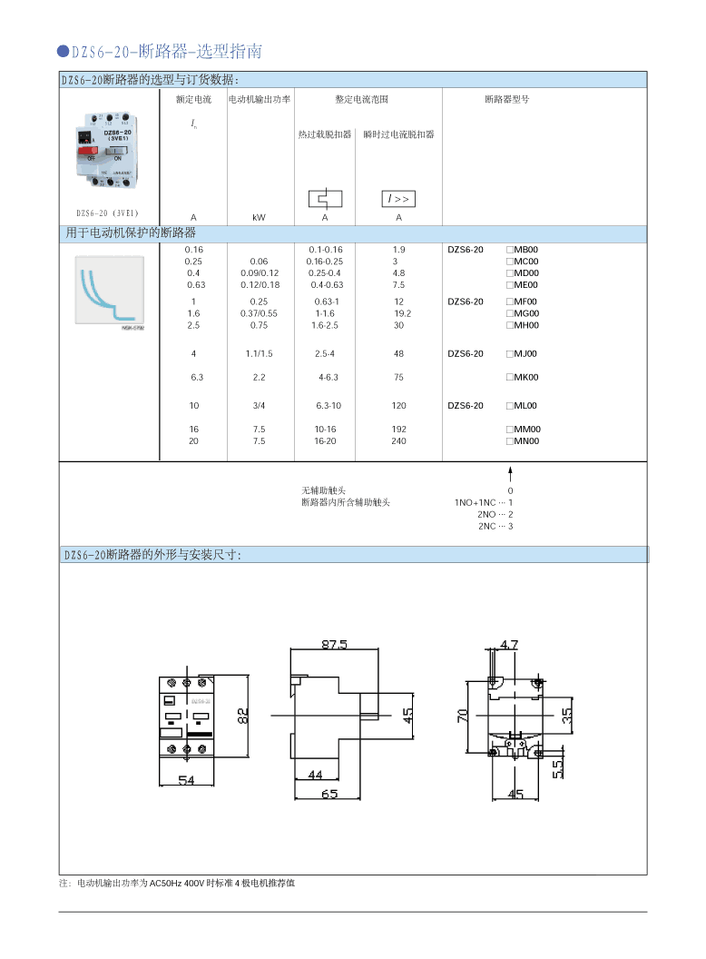 ① DZS6-20 系列斷路器集合了熱過載保護,短路保護,接通 / 分斷功能于一體。