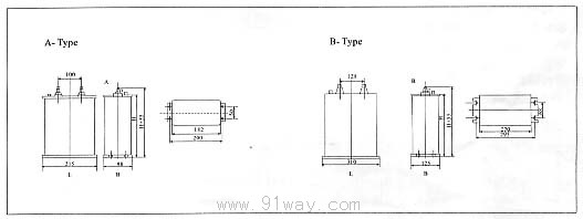 注:本表格所例的高度不包含接線端子的高度,A、B圖型電容器接線端子高度均為55mm