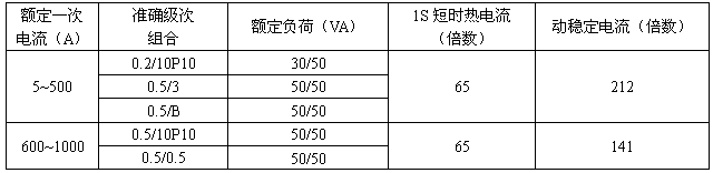 額定電流、準確級次組合、額定負荷、短時熱穩定電流及動穩定電流見下表