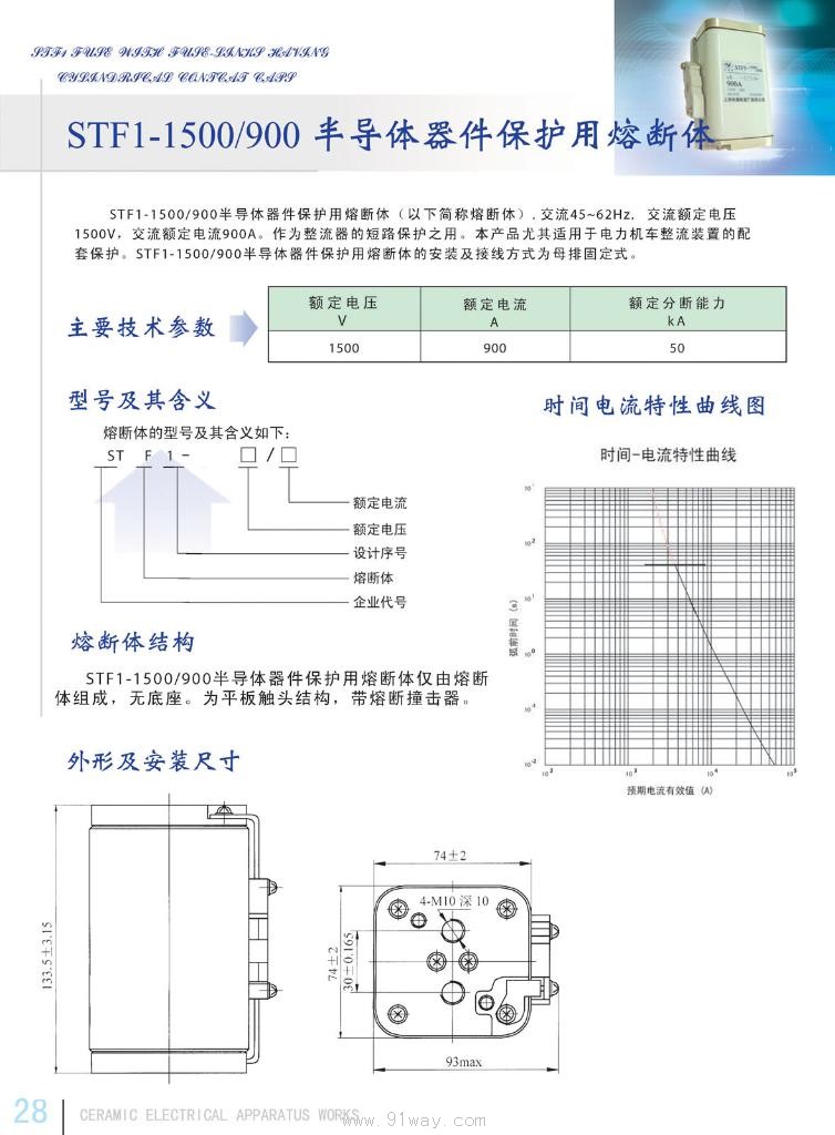 STF1-1500/900半導體器件保護用熔斷體(以下簡稱熔斷體),交流45~62Hz, 交流額定電壓1500V,交流額定電流900A。作為整流器的短路保護之用。本產品尤其適用于電力機車整流裝置的配套保護。STF1-1500/900半導體器件保護用熔斷體的安裝及接線方式為母排固定式。