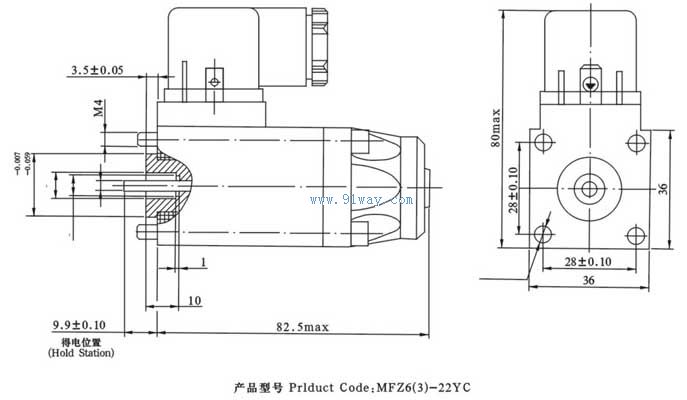 MFZ6-22YC直流濕式閥用電磁鐵 額定電壓:DC 24、110V 額定吸力:22N 額定行程:2.8mm 工作油壓:16MPA 安裝尺寸:28×28mm