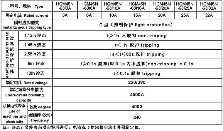 用途:HGM45N斷路器適用于交流50Hz,額定電壓至380V,額定電流至32A的線路中,用來對建筑物和類似場所的線路設施和電氣設備進行過電流保護,亦可用于不頻繁的通斷操作. 特點:HGM45N斷路器是與新型建筑發展相配套的新型建筑電器,它體積小、安全性能好、可靠性強、無飛弧、分斷能力高、外形設計美觀大方,在新型建筑領域內深受歡迎。 HGM45N系列高分段小型斷路器型號及含義: HGM45N系列高分段小型斷路器技術參數:
