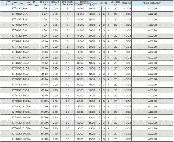 DTSQ2型ATS作為主備雙電源自動切換開關采用電磁驅動,電氣機械同時連鎖機構,主回路觸頭為靜、動結 構,動觸頭采用V型設計。為避免電磁線圈長期帶電,采用電動合閘,機械保持,控制電源均引自主備電流交流220V (無須另加控制電流)由于結構特點優越,故主備電源不會同時接通發生事故。開關有電氣或機械合閘指示,同時可以為客戶提供常開常閉無源輔助 觸點供客戶其它之用。DTSQ型A - T - S切換時間為1~30S 可調(常規出廠時為3S),如需更長時間請與制造商聯系。