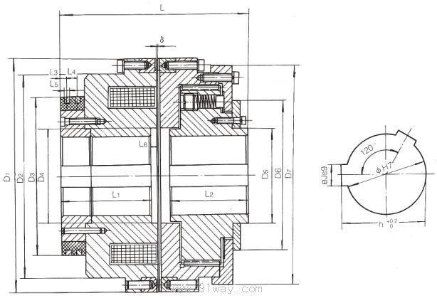 安裝示意圖與安裝尺寸 mm 注:該系列離合器為雙鍵,兩鍵位置呈120o分布