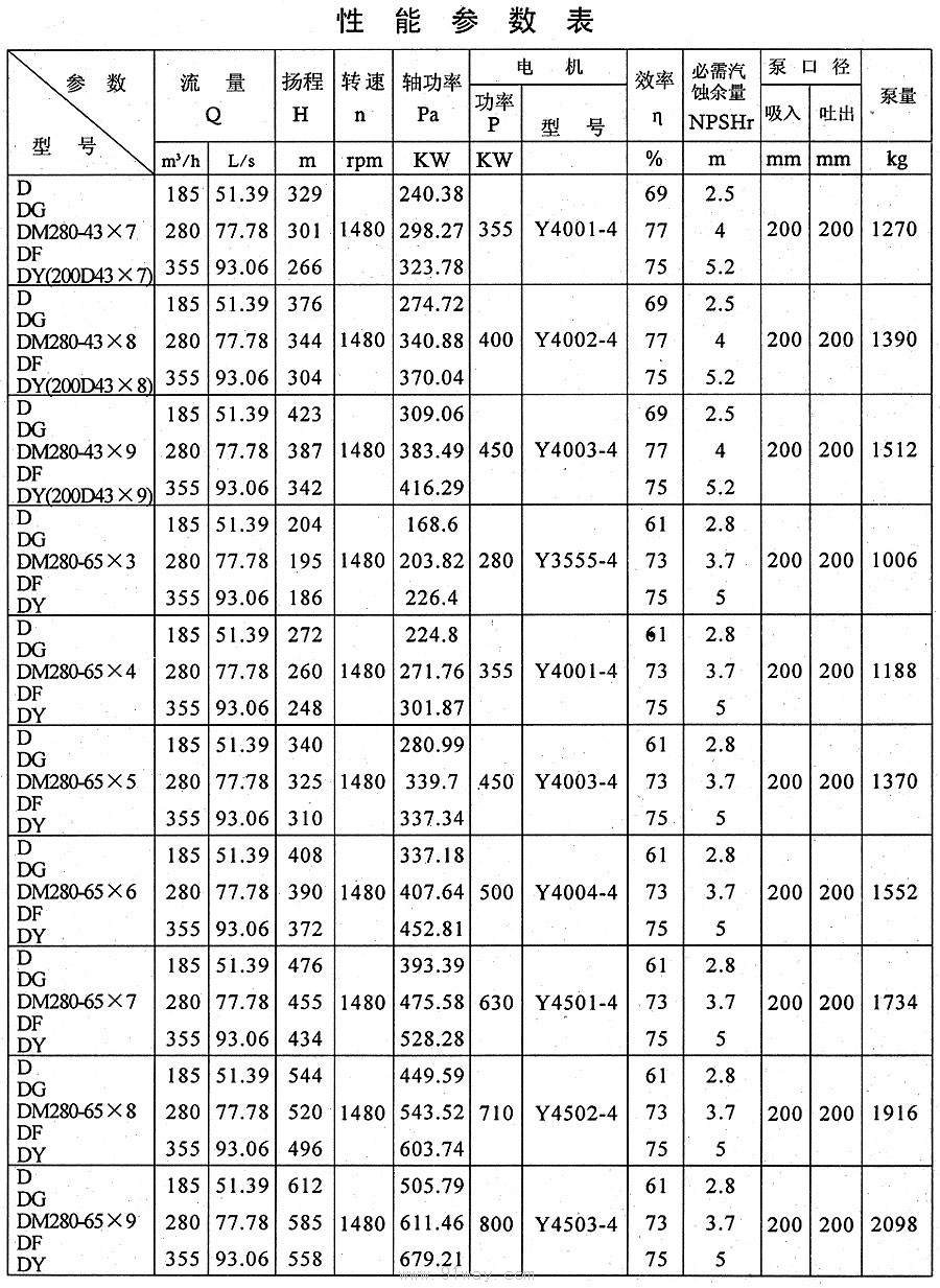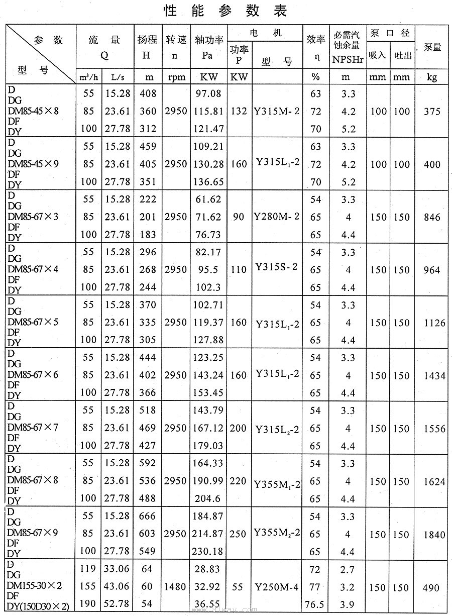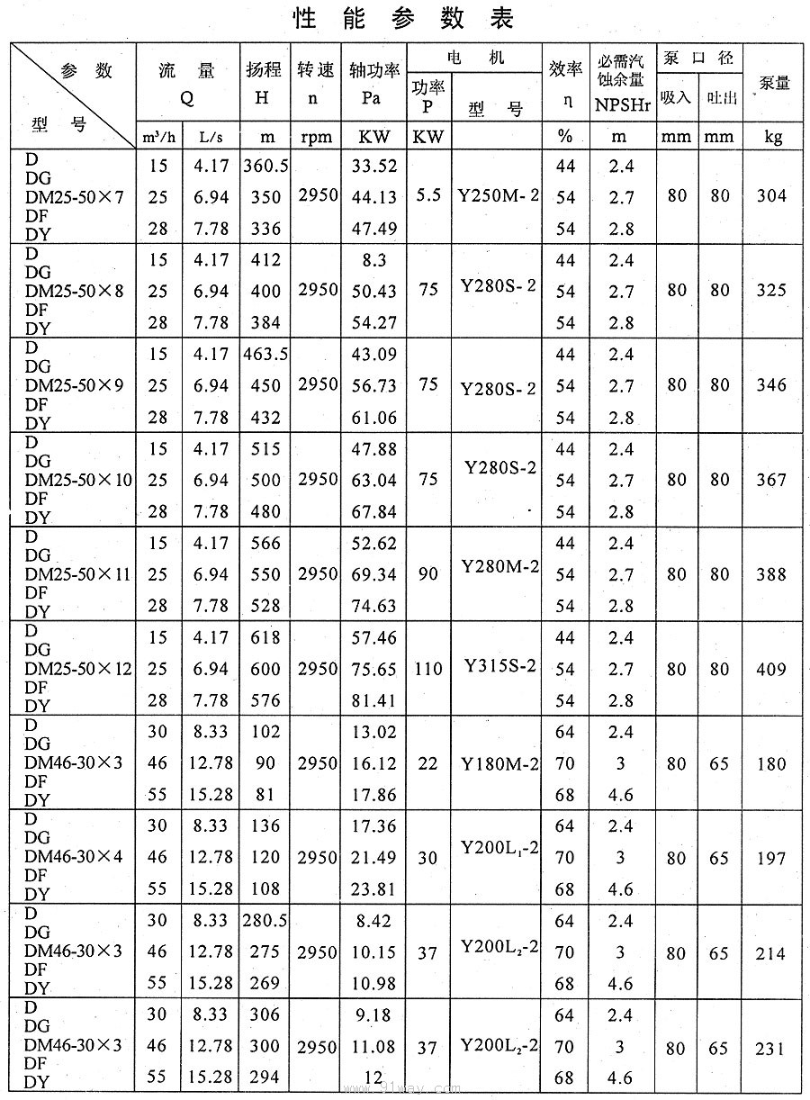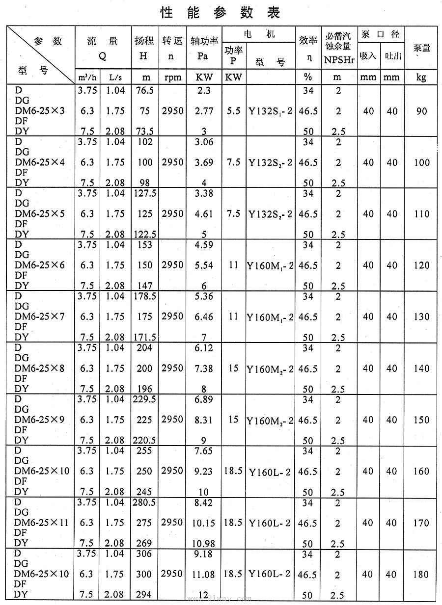 D、DG、DM、DF、DY型多級離心泵技術參數10