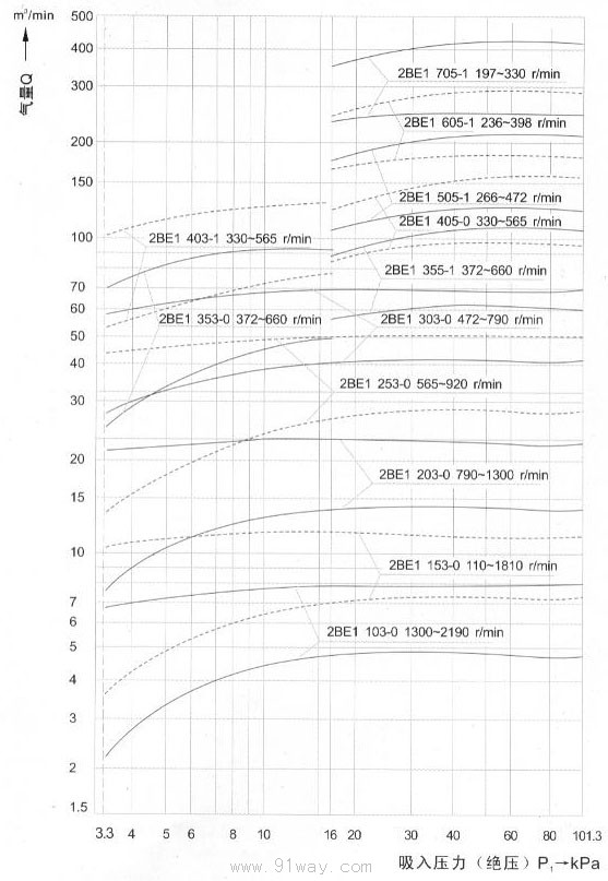| 型號 | 極限真空度kPa | 轉速(r/min) | 不同真空度時的氣量m3/min | 功率(Kw) | 西排氣 口徑DN |