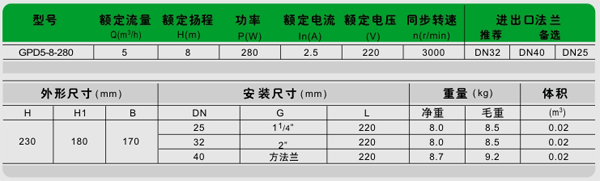 GPD5-8-280型單相管道屏蔽電泵技術數據:
