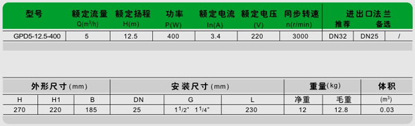 GPD5-12.5-400型單相管道屏蔽電泵技術數據: