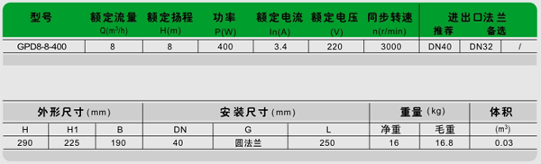 GPD8-8-400型單相管道屏蔽電泵技術數據: