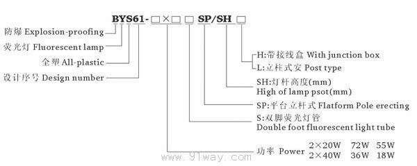 BYS62-SP型平臺立桿式圓筒型全塑防爆熒光燈(ⅡB)型號含義 □Model Meaning