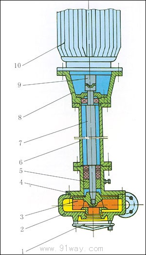 1.防護(hù)罩 2.泵體 3.葉輪 4.泵蓋 5.密封體 6.導(dǎo)管 7.泵軸 8.托架 9.聯(lián)軸器 10.電動(dòng)機(jī)