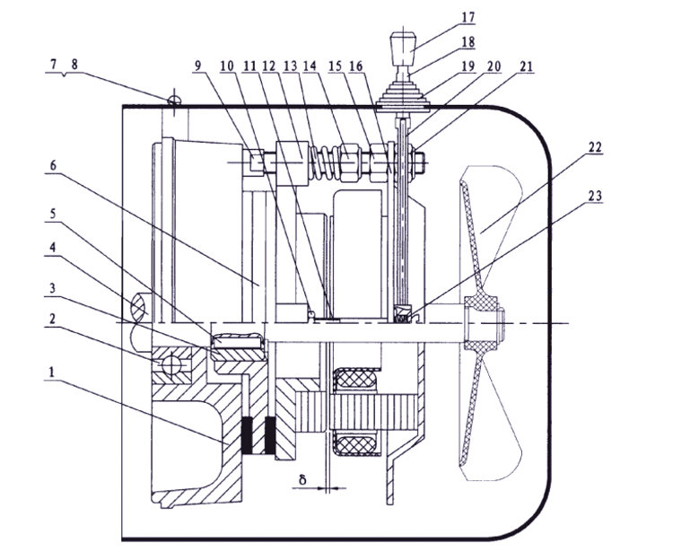 1、后端蓋2、軸承3、花鍵襯套4、轉子5、普通平鍵6、制動盤7、十字螺釘8、彈簧墊圈9、螺桿10、螺母11、拉桿螺釘12、銜鐵板13、制動彈簧14、保險螺母15、螺母16、磁軛17、膠木手柄18、手柄螺母19、防塵蓋20、釋放環21、保險螺母22、風扇23、復位彈簧δ、間隙
