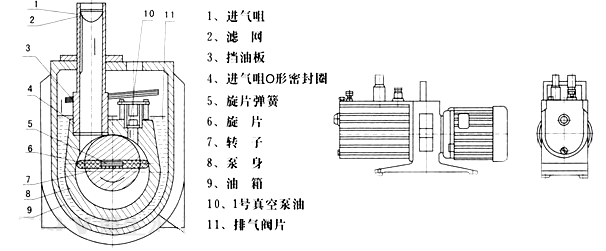 2XZB型旋片式真空泵雙級高速直聯結構旋片式真空泵(以下簡稱泵)。旋片式真空泵有獨立油泵制潤滑。偏心地裝在泵腔內的轉子,及轉子槽內的旋片。轉子帶動旋轉時,旋片緊貼腔壁,把進、排氣口分隔開來,并使進氣積腔容積周期性地擴大而吸氣,排氣腔容積則周期性地縮小而壓縮氣體,推開排氣閥排氣,從而獲得真空。圖一為單級泵的工作原理示意圖。雙級是兩個單級串聯而成。