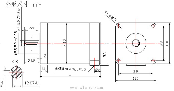 | 型號 | 電壓(V) | 電流(A) | 每相電阻(Ω) | 保持力矩(g.cm) | 轉(zhuǎn)動慣量(g.cm2) | 接線圖 | 外形尺寸L(mm) |
