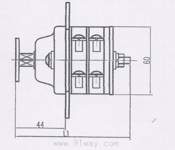 F9系列輔助開關是由多節組合而成的,本體內部結構如圖一所示。每節上方兩側都有標號表示本觸頭的號數,同一節中對角線形成一對常開(或常閉)回路,常開(或常閉)的確定由操動軸上的指示片顯示,指示片指向一組接觸界限內,說明本組為接觸可靠的一對常閉接點(回路),其余的為一對常開接點。