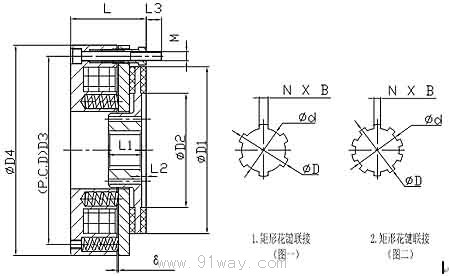 該系列電磁失電安全制動(dòng)器主要由勵(lì)磁部分(磁軛1、線圈2、彈簧3、銜鐵4)、制動(dòng)盤(pán)7、花鍵套8等主要零部件組成。勵(lì)磁部分通過(guò)安裝螺栓6安裝在機(jī)座上,旋轉(zhuǎn)安裝螺栓6調(diào)整氣隙至初始安裝氣隙推薦值δ后(見(jiàn)安裝尺寸參數(shù)表),反向旋出空心螺栓5,頂緊勵(lì)磁部分;ㄦI套通過(guò)矩形花鍵與傳動(dòng)軸相連;制動(dòng)盤(pán)7與花鍵套8通過(guò)漸開(kāi)線花鍵嚙合。當(dāng)線圈斷電時(shí),在彈簧力的作用下,制動(dòng)盤(pán)7與銜鐵4、機(jī)座9端面產(chǎn)生摩擦力,通過(guò)花鍵套8傳給傳動(dòng)軸,使軸制動(dòng)。當(dāng)線圈通電后,在電磁力作用下,銜鐵4被吸向磁軛1,使制動(dòng)盤(pán)7松開(kāi),傳動(dòng)軸制動(dòng)解除。