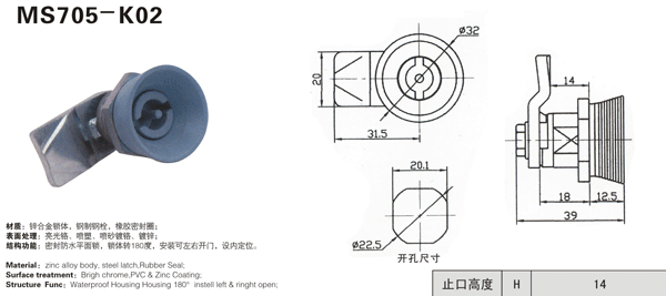 電柜門鎖MS705-KO2 材質(zhì);鋅合金鎖體,鋼制鋼栓,橡膠密封圈; 表面處理;亮光鉻、噴塑、噴砂鍍鉻、鍍鋅;