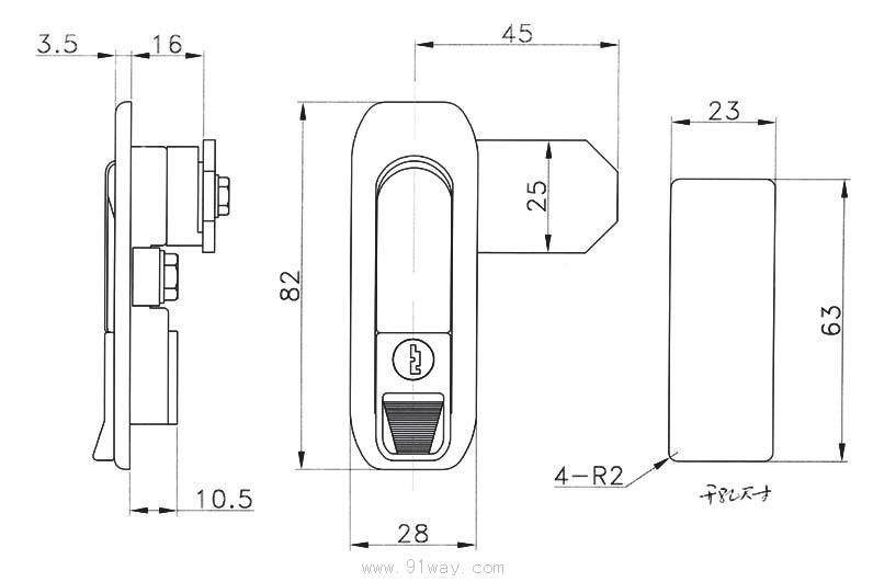 結構功能:平面鎖;單點鎖住;調換鋼栓方向可實現左右開門;鋼栓具有收縮鎖緊功能;有無鎖芯及帶鎖芯兩種規格供選擇;鋼栓旋轉角度:90度;
