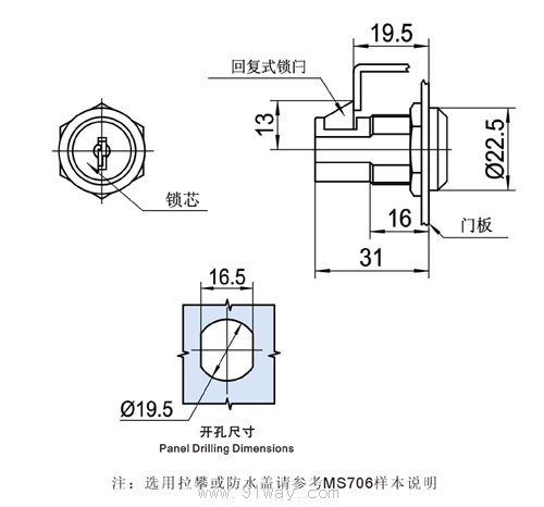 MS826-1電柜門鎖止口高度 19.5 產品簡介 材質及表面處理:鍍鉻鋅合金基座、鎖舌,鍍鋅鋼齒圈