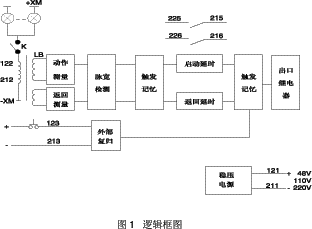 JC-13、14型繼電器由變壓器、測量取樣脈寬檢測、觸發記憶、自動復歸、延時動作和延時返回及穩壓電路組成。邏輯框圖見圖1。