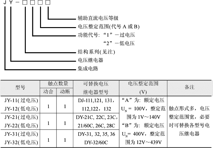 注:(JY-10代表凸出式,JY-20代表凸出插入式,JY-30代表嵌入插入式)為便于用戶替代更換各型號電壓繼電器,請按下表對照: