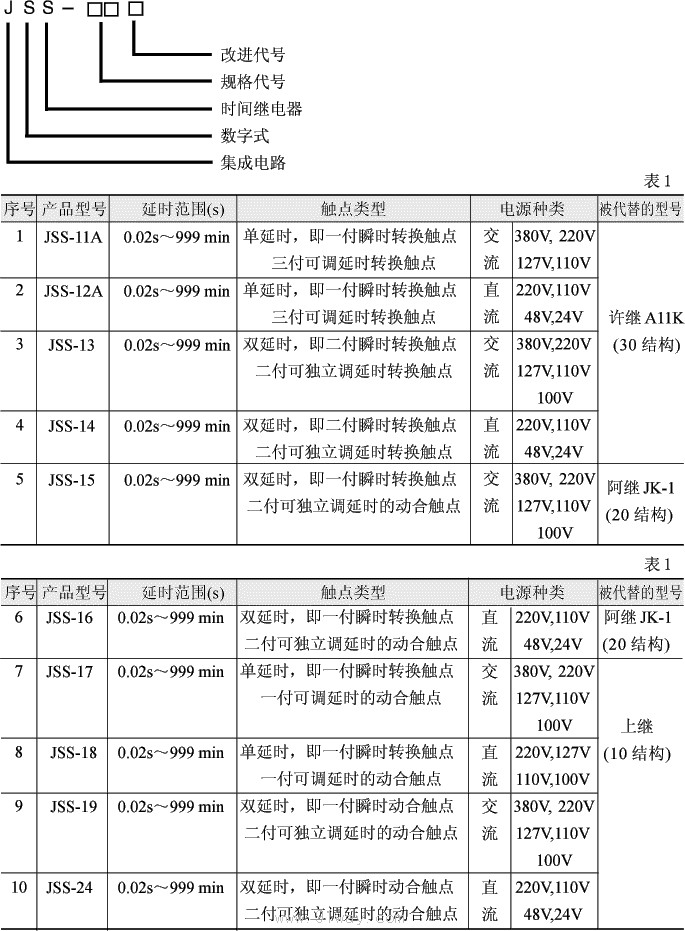 JSS系列時(shí)間繼電器型號及分類及規(guī)格由表1給出