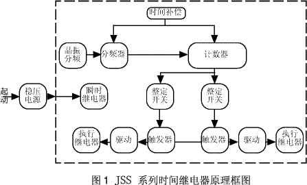 繼電器一旦施加額定電壓,內(nèi)部瞬動繼電器動作并出口,同時(shí)使晶體起振,產(chǎn)生時(shí)鐘脈沖,經(jīng)分頻后計(jì)數(shù)器計(jì)數(shù),當(dāng)所計(jì)脈沖數(shù)達(dá)到延時(shí)整定值時(shí),觸發(fā)器翻轉(zhuǎn),驅(qū)動執(zhí)行繼電器動作出口。